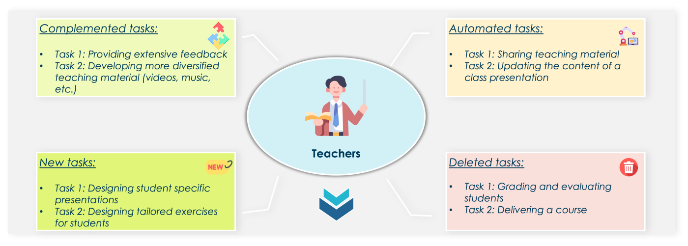 Automated tasks encompass the instantaneous sharing and updates of class materials, making them readily available to all students. New tasks may involve crafting customised curricula and presentations tailored to individual students. Furthermore, the traditional task of delivering course materials can be phased out if all students can access personalised presentations on-demand through AI. Collectively, these developments empower teachers to amplify their impact on students through intelligent AI utilisation.