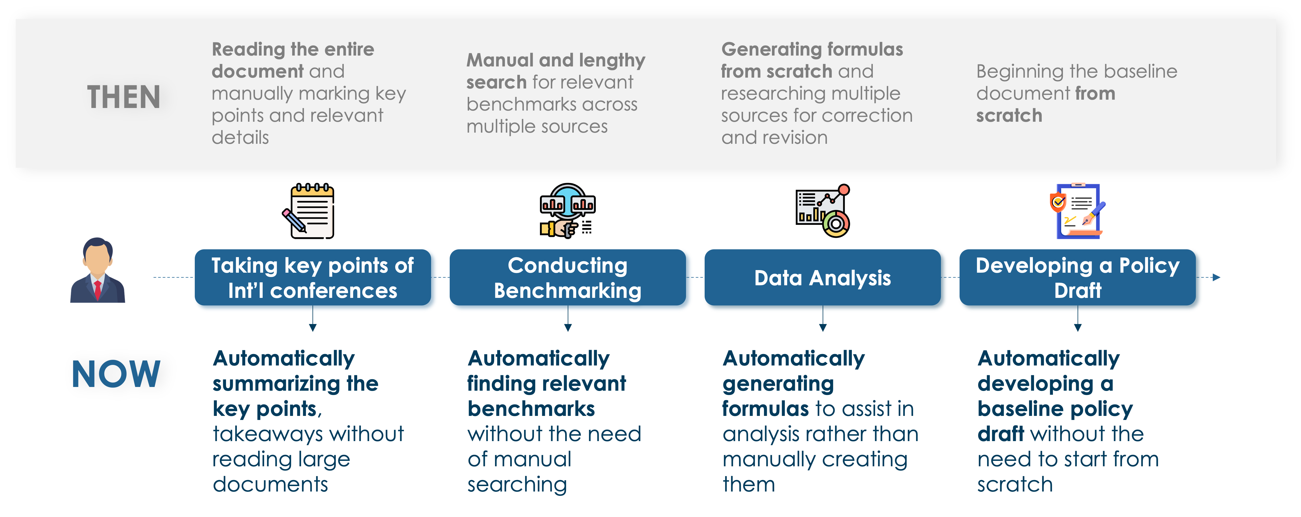 To illustrate further, let’s consider another scenario: the bureaucrat featured in our demonstration could delegate tasks such as conference summaries, data analysis, country benchmarking, and legislative drafting to the Large Language Model (LLM). This would free up their higher-level skills to ensure that the new legislation on crime prevention incorporates relevant feedback and follows the appropriate legislative procedures.