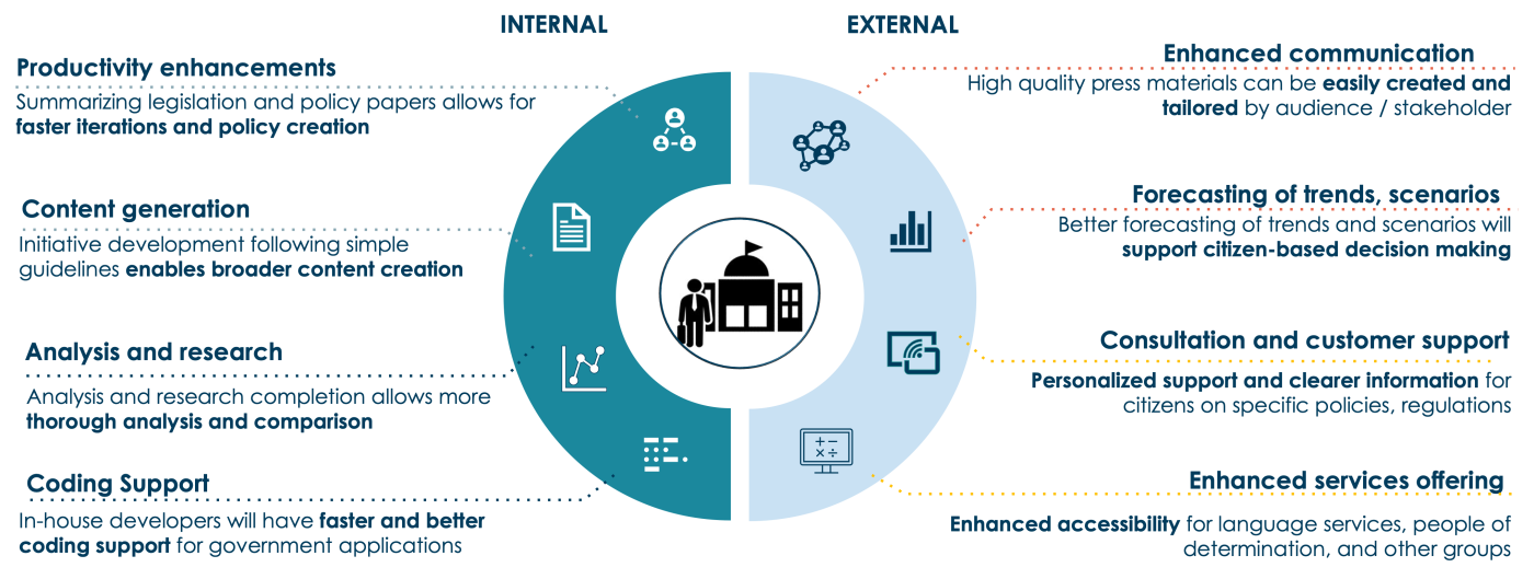 On a broader scale, Large Language Models can play a pivotal role in augmenting the public sector’s effectiveness, both internally and externally (refer to Figure 4). Internally, these models, known for their generative capabilities, not only boost the productivity of civil servants but also enhance creativity. They assist in generating relevant, well-structured content, thereby streamlining and expediting the development and implementation of public policies and legislations, as exemplified in the earlier demonstration.